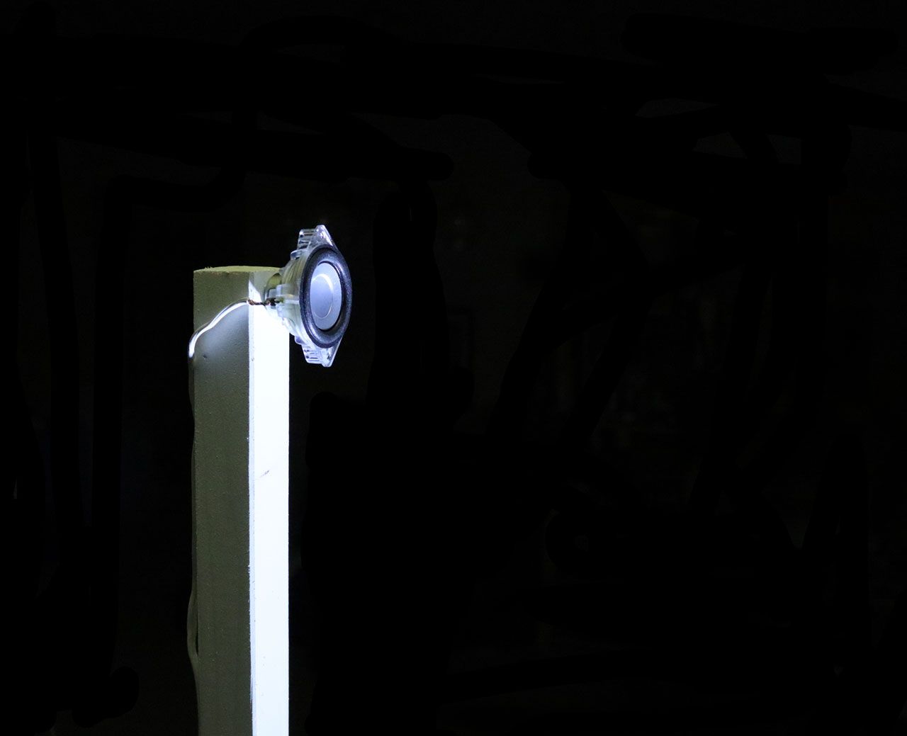 Bei dem Objekt mit der Bezeichnung Maske habe ich mit meiner Familie zusammengearbeitet und hatte die Idee, dass wir uns durch diese Arbeit miteinander verbinden. Die verwendeten Klänge stammen von der Herstellung des Objektes und aus Gesprächen mit meiner Familie und Freunden, die ich nach ihrem Traum befragt habe. All das erklingt in einem verbindenden Klangnetz aus vier Lausprechern.